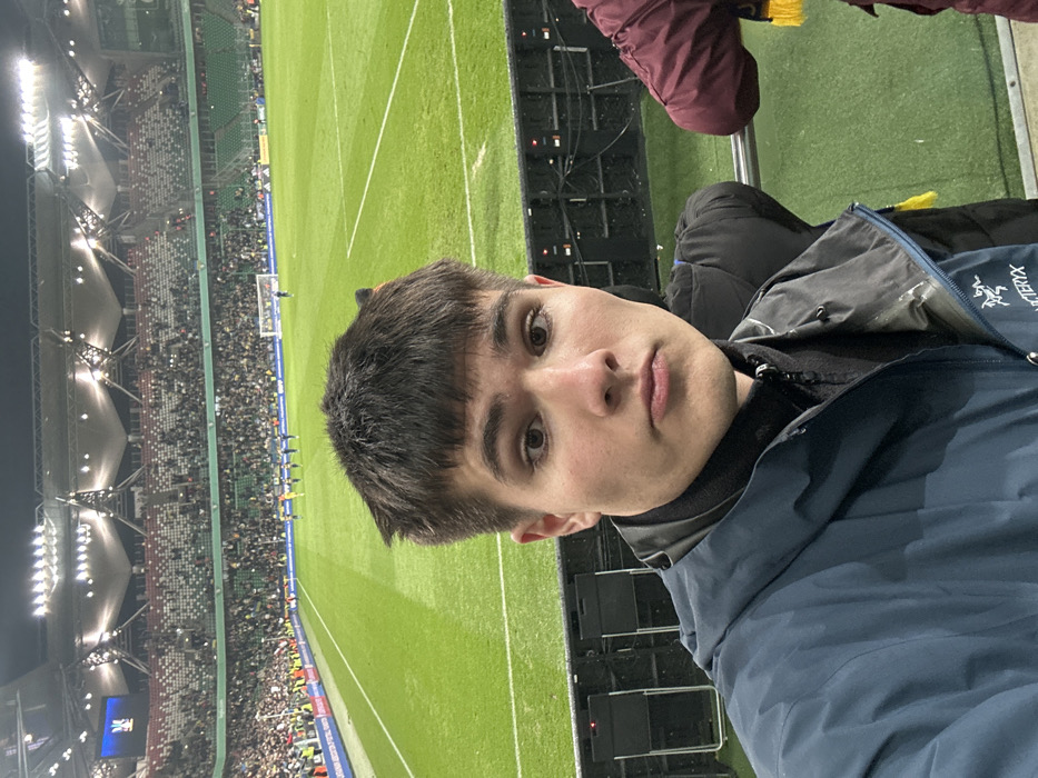 A young man takes a selfie at a soccer game in a stadium. He is wearing a blue jacket with the logo "Arc'teryx." The field is green, and the stands are packed with people. The lighting is bright. The perspective is tilted, showing the man in the foreground and the stadium in the background.