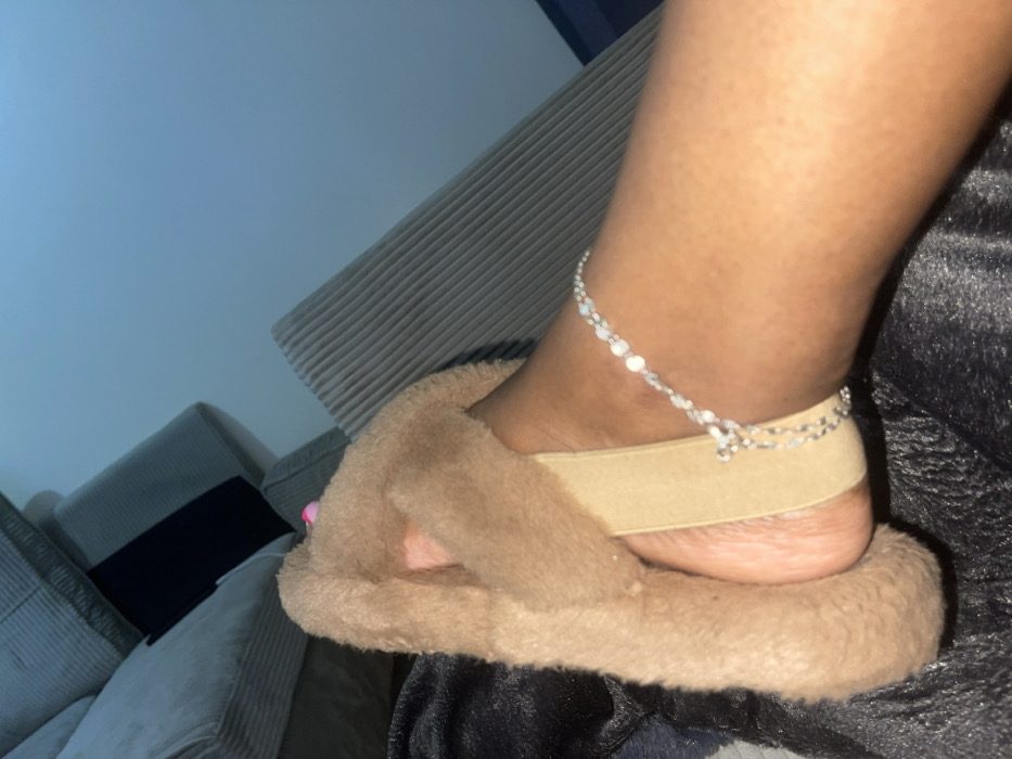 A close-up shot features a person's foot adorned with a fluffy, brown slipper. The slipper has a beige strap. An anklet with delicate silver chain details encircles the ankle. The background reveals portions of a couch with patterned cushions and a glimpse of a light blue wall. A dark-colored fabric is below the slipper.