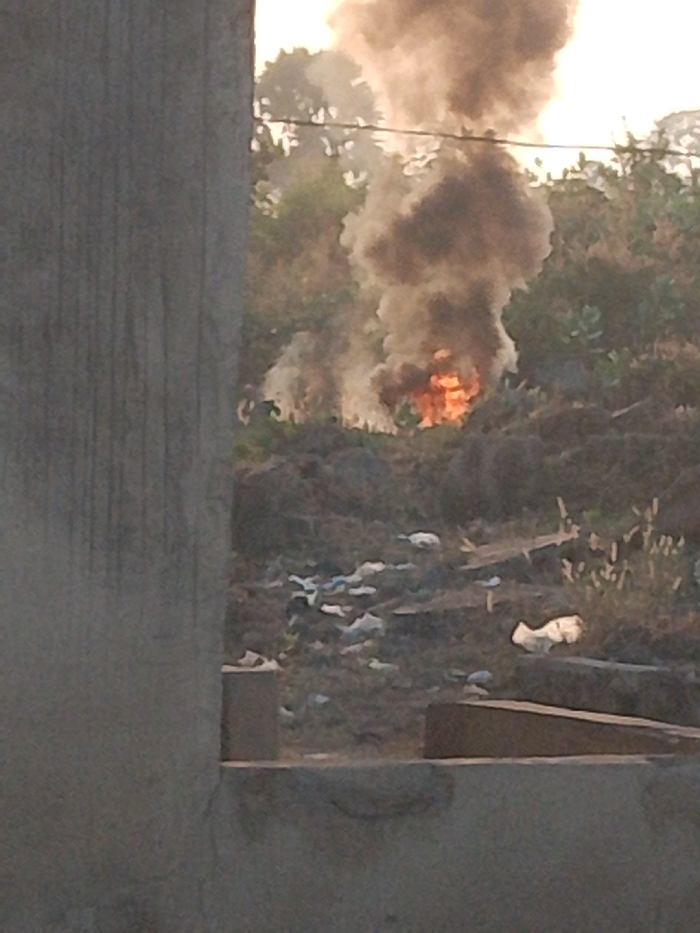 A plume of dark smoke rises from a fire, visible behind trees and vegetation. In the foreground, a hillside littered with trash descends towards a concrete wall or structure. The image appears to be taken from inside or near another building, partially obscuring the view with a wall and window. The overall scene suggests an uncontrolled fire in an area with refuse, potentially posing environmental and safety concerns.
