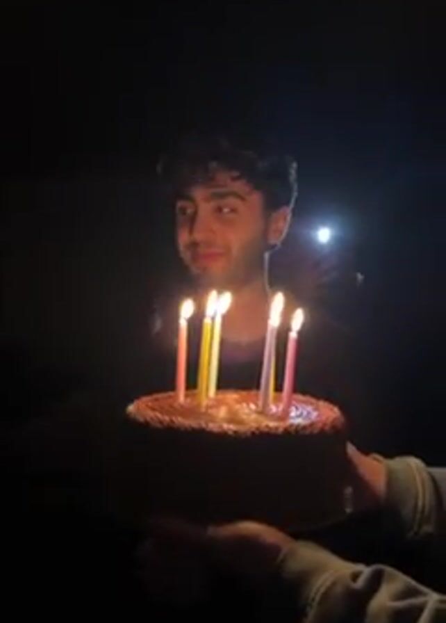 In a dark room, a young man with curly hair and a small beard looks at a chocolate birthday cake with several lit candles, held out by a person in a gray hoodie. The light from the candles and a flashlight, briefly shone on the subject’s face, illuminates the scene. A woman appears in the background on the left. An upbeat pop song plays in the background.