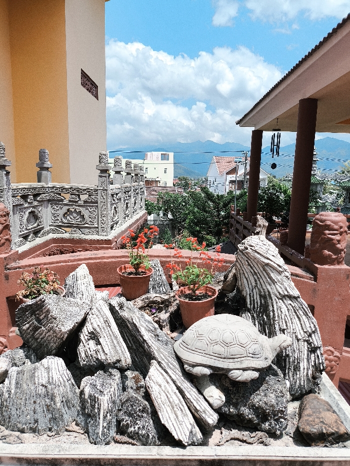This image depicts an elevated outdoor scene within the city of Diên Khánh, Vietnam, under a bright blue sky with scattered white clouds. In the foreground, a decorative rock garden is arranged, featuring several light gray, textured rocks, some resembling petrified wood. A light gray stone statue of a turtle, with a hexagonal pattern on its shell, is prominently placed among these rocks, facing to the right. Behind the rock arrangement, three potted plants with red-orange flowers are visible; two appear vibrant, and one is less so. To the left, a section of a light yellow building wall with a dark rectangular decorative vent or panel is present. An ornate, gray stone balustrade with intricate carvings, including lotus motifs and geometric patterns, forms a barrier at the edge of the elevated platform, adorned with several small finials. To the right, a veranda or covered patio structure is visible, featuring a brown tiled roof supported by two thick, reddish-brown pillars. A dark wind chime with cylindrical pipes hangs from the veranda's roof. A reddish-brown, textured decorative element, possibly a stylized statue, is situated on the railing to the right of the turtle. The background reveals a townscape with various residential buildings, including a pale yellow multi-story building with a square window and a white house with an orange-tiled roof. Beyond the urban area, distant blue mountains are visible along the horizon. A tall, green, multi-tiered structure, resembling a pagoda, is partially visible behind the rightmost veranda pillar. No individuals are present in the scene.