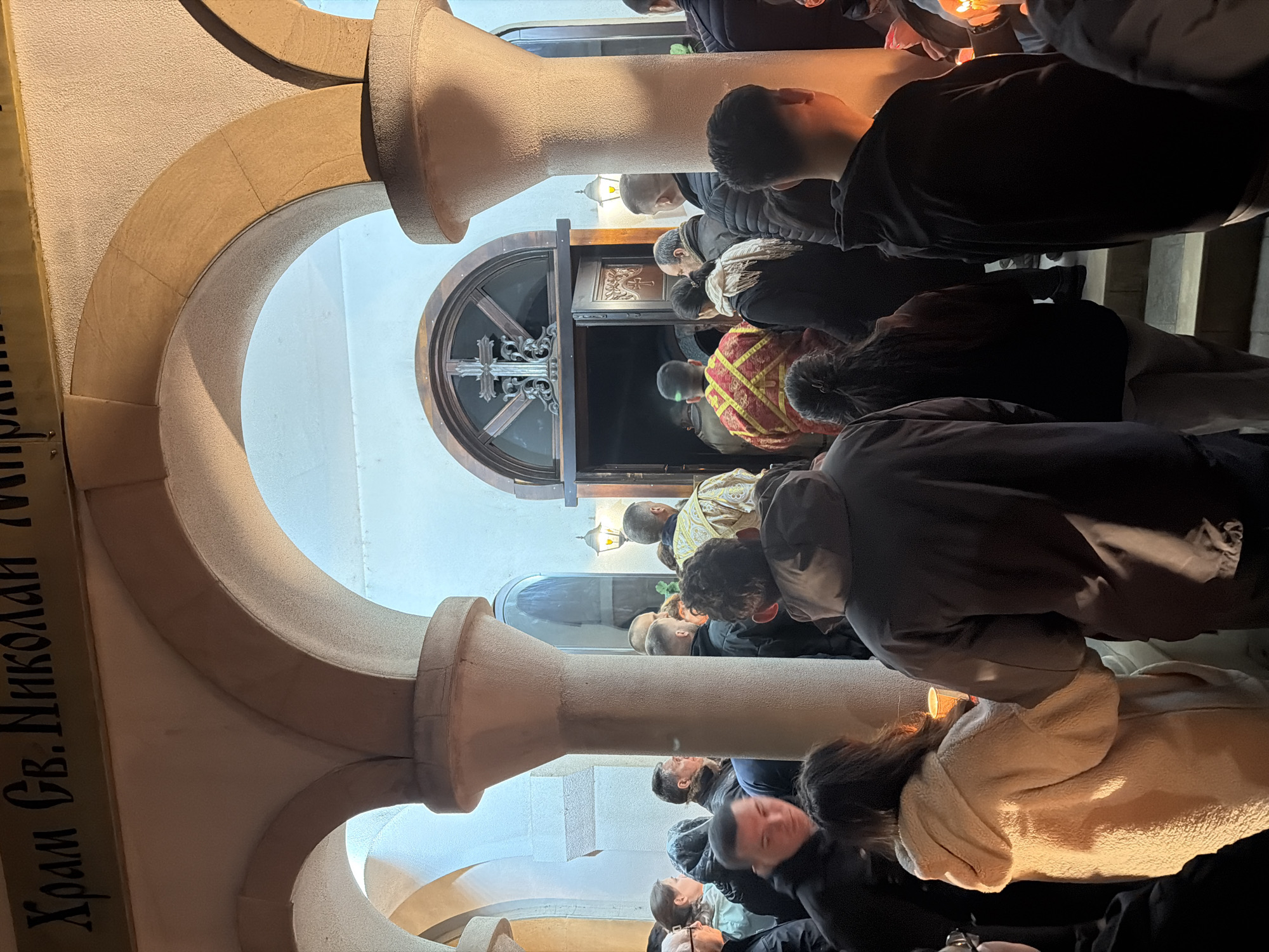line of people, likely inside or just outside the entrance of a church. A clergyman wearing a red and yellow robe is visible among them. The people are bowed or kneeling, possibly praying or venerating something inside the church. The location is suggested by the inscription on the left, which reads "Храм Св. Николай Мирлик." indicating the Church of Saint Nicholas in Mirikovo (Мирково), Elin Pelin, Bulgaria. The scene is framed by an arched stone doorway. Some people are holding lit candles. The people are primarily dressed in dark or neutral-colored clothing.