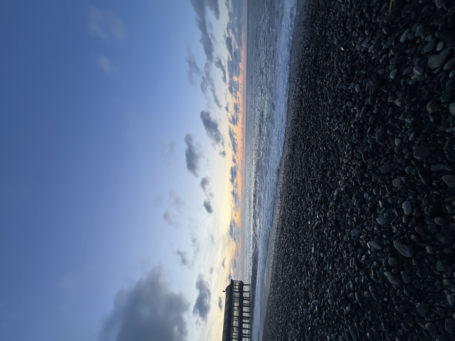 The image displays a coastal scene in Batumi, Georgia, during twilight or sunset. The foreground features a dark pebble beach, densely covered with smooth, rounded stones of varying sizes, extending across the lower half of the frame. In the midground, the Black Sea is visible with moderate waves breaking onto the shore, characterized by white foam along the waterline. The sea surface reflects the dim light, appearing dark blue-grey. To the far left of the midground, a substantial, multi-story structure resembling a building or restaurant with numerous windows is positioned on a pier extending out over the water. This structure is supported by multiple vertical columns or pilings. A faint, possibly artificial, light source is visible on its roof. No individuals are discernible on the beach or the structure. The sky, occupying the upper half of the image, transitions from a deep blue at the top to lighter blues, purples, and an orange-pink glow near the horizon, indicative of a sunset. Scattered clouds, ranging from dark grey to lighter tones, are present across the sky, particularly clustered near the horizon. No specific human actions or interactions are depicted. The overall environment is coastal and devoid of human activity within the frame.
