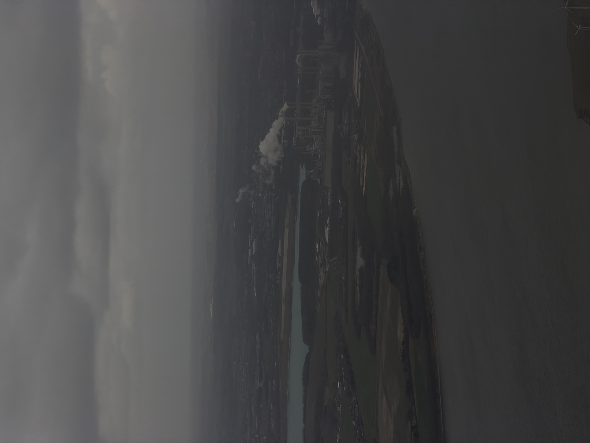 n aerial view of Aalborg, Denmark. A large body of water, likely the Limfjord, runs vertically through the frame, with landmasses on either side. On the right side of the water, the landscape consists of green fields and vegetation. A city with buildings is visible on the left side of the water, partially obscured by fog. An industrial complex with smokestacks emitting white smoke is visible.