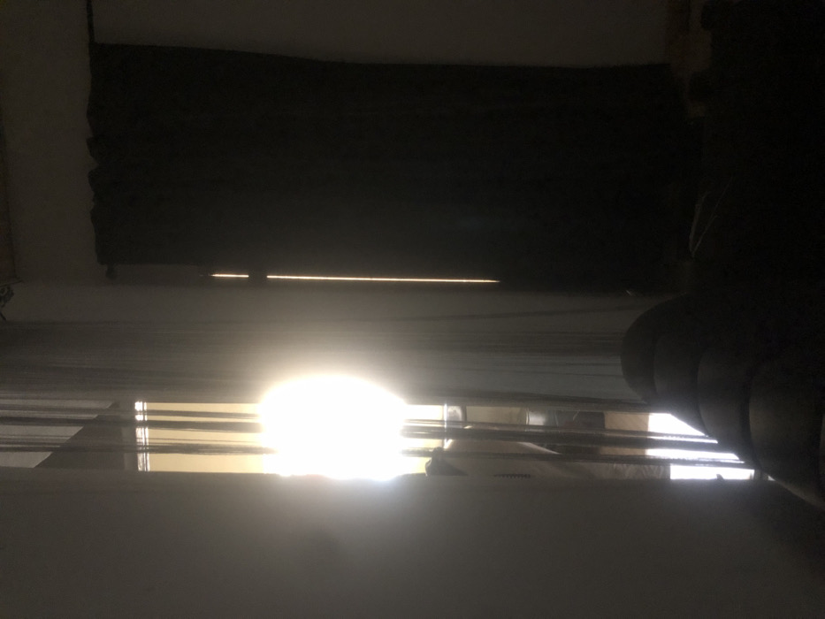 The scene depicts the interior of a room in Maigizo, Nigeria, looking towards a window. A strong, circular-shaped bright light source, consistent with direct sunlight, dominates the central left portion of the frame, causing significant overexposure. Sheer, vertical-strand curtains are visible directly in front of this intense light. To the right, a dark, opaque curtain is drawn, with a narrow vertical strip of light visible along its left edge. The room's interior is largely dark, with the upper portion of a dark, upholstered furniture item (possibly a sofa or chair) visible in the lower center and right foreground. A faint, elongated reflection or silhouette, potentially human, is discernible within the bright glare on the left side of the window area. No direct human figures or specific actions are identifiable within the room.