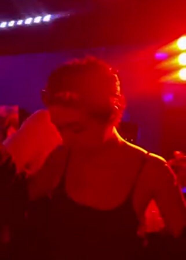 A woman in a black tank top is standing and dancing in what appears to be a nightclub or bar, illuminated by red and purple lights