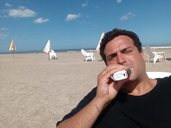 An outdoor photograph captures a male individual on a sandy beach in Mar de las Pampas, Argentina, under a clear blue sky. The man, positioned on the right side of the frame from the chest up, has dark, curly hair and wears a black t-shirt. He holds a white and gold electronic vape device to his mouth with his right hand. A gold ring is visible on his right ring finger, and a silver chain bracelet is on his left wrist. He looks directly forward. The background consists of a wide, light-brown sandy beach extending towards the ocean. The ocean, exhibiting small waves, meets the horizon beneath a blue sky with scattered white cumulus clouds. On the beach, from left to right, are a closed light-colored beach umbrella, followed by a closed white beach umbrella next to a stack of three white plastic beach chairs. Additional white plastic beach chairs are partially visible further right. Small, indistinct human figures are discernible in the distance near the waterline. The scene is brightly illuminated by natural sunlight.