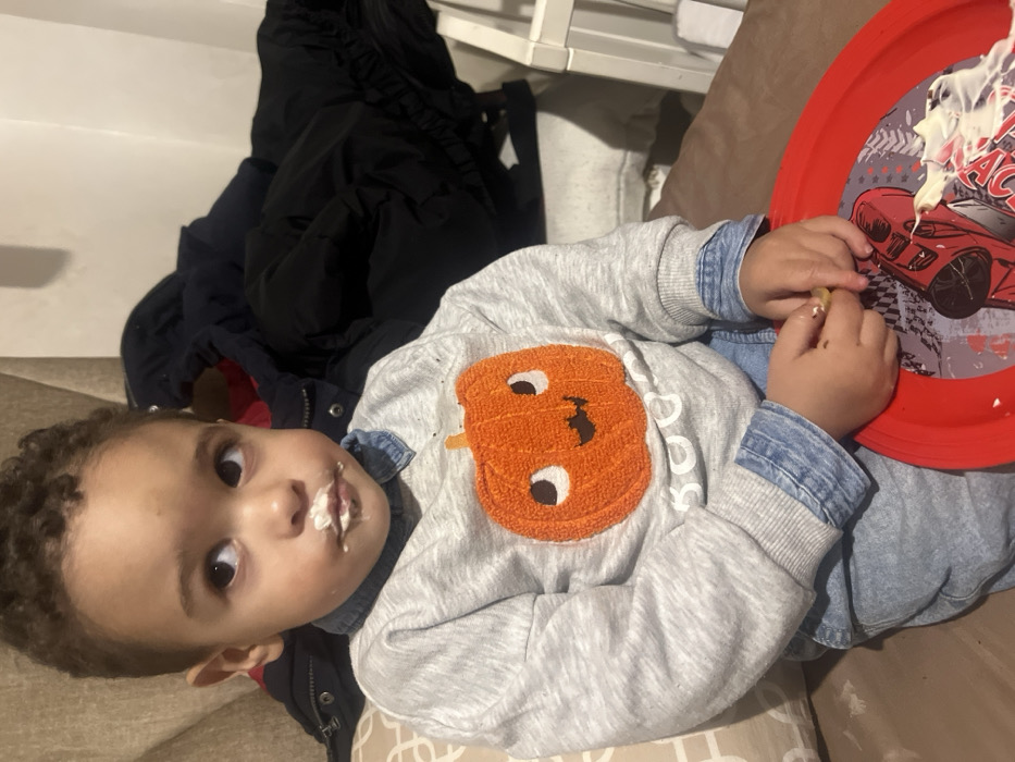 A young child with curly hair and cream on their mouth lies on a couch. The child is wearing a gray sweatshirt with an orange pumpkin design and a denim shirt underneath. They hold a red plate decorated with a race car and white frosting. A black jacket rests beside the child on the couch. A white crib or changing table is visible in the background.