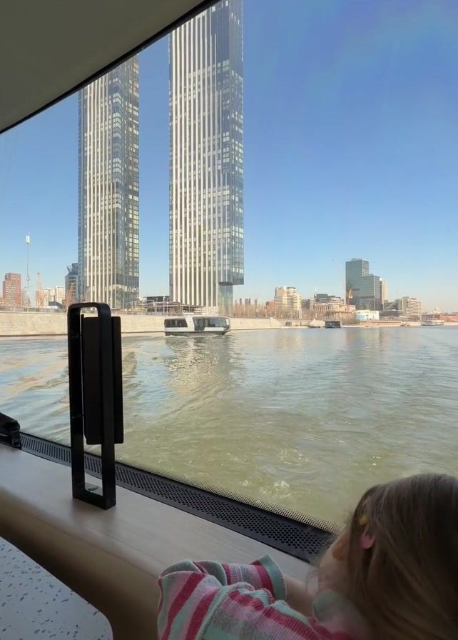 From the vantage point inside a vessel, a child with blond hair rests against a windowsill, gazing out at the scene unfolding beyond a large window. Outside, the camera frames the Moscow skyline, marked by two prominent, striped skyscrapers. The river flows, reflecting the sunlight and the city's silhouette. Another smaller boat travels along the water. The sky is a clear blue.