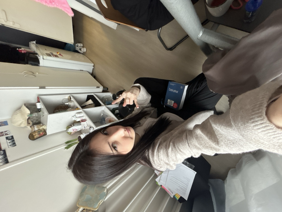 The scene depicts the interior of a residential room in Nanterre, France, likely a student accommodation given the "Code pénal" book visible. A young adult female with long dark hair and a light complexion is seated on a light wood-effect floor, looking directly at the camera. She is wearing a light beige knitted cardigan over a white shirt and black trousers. Her right hand is raised, forming a "rock on" gesture. A blue book, identified as "Code pénal," rests open on her lap. Behind the female, against a white wall, is a white modular shelving unit displaying various items, including a light-colored bucket hat, two decorative religious figurines, multiple bottles and containers, and a potted plant with green leaves. To the right of the shelving unit, a white two-door cabinet is visible. Adjacent to the cabinet, a white compact refrigerator stands, with a pair of white sneakers on the floor in front of it. A white door is partially open on the far right, revealing a darker space beyond. To the female's immediate left, a dark surface, possibly a desk, holds stacks of paper documents secured with colorful divider tabs. A light blue and mint green colored handbag is partially visible hanging on the far left. On the right side of the frame, the lower leg of another individual, clad in black trousers, is visible behind a metal-framed chair with a wooden backrest. A pink, fluffy object is partially visible draped on an unseen object on the far right. White vertical blinds are visible on the extreme left.