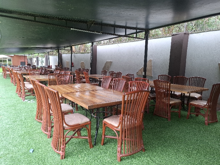 n outdoor dining area at a restaurant in Karagita, Kenya, located at coordinates -0.754 latitude and 36.437 longitude. The area is covered by a large awning supported by metal beams. The tables and chairs are made of wood and are arranged in rows under the awning. The chairs are brown wicker and the tables are dark wood with a light wood finish. The floor is covered in artificial green grass. There are no people present in the image. The restaurant is located in a suburb of Nairobi. It is unclear what time of day it is or if the restaurant is open.