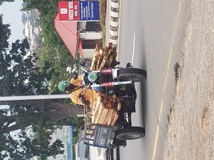 A daylight scene on a paved road in Adankolo, Nigeria, depicts an adult male operating a blue and red motorized tricycle. The man is attired in a yellow short-sleeved top and a green baseball cap, positioned on the vehicle and gripping the handlebars. The tricycle's rear cargo bed is heavily loaded with numerous light-colored wooden planks, stacked horizontally and extending beyond the vehicle's lateral confines. The road surface features white and yellow lane markings and exhibits minor irregularities. In the background to the left, a portion of a white sedan is visible behind a large tree and a utility pole. To the right, a building with a red corrugated metal roof stands adjacent to a blue and red billboard displaying "UMZEE SOYA VEG. OIL." The far background shows residential structures interspersed with trees on elevated ground.