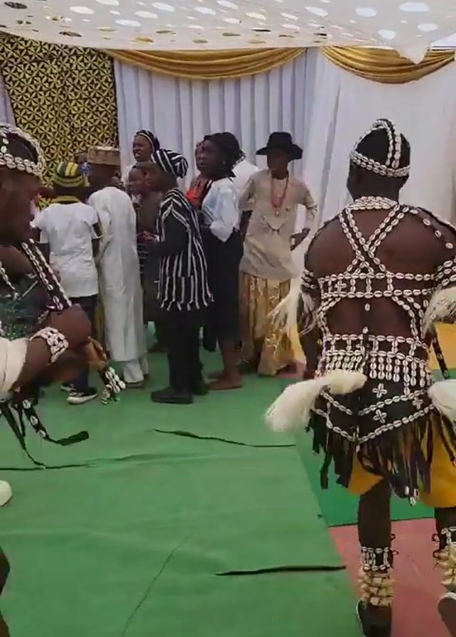 group of men performing a traditional dance at what appears to be an event held in a tent-like structure with a green carpet