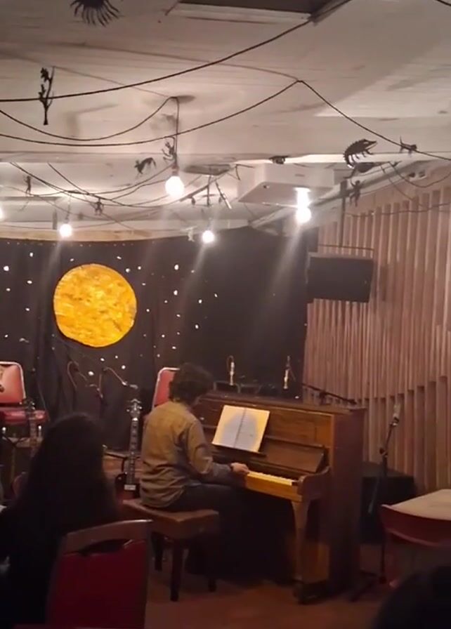 A man is playing a piano in a room. The room has a stage area decorated with a large yellow circle, perhaps representing the moon, against a dark background dotted with white lights. Two red chairs and a guitar are visible on the stage. Several black silhouettes of various animals and shapes are suspended from the ceiling by wires along with white lights. A few people are seated at tables, watching the pianist. A music stand is on the piano.