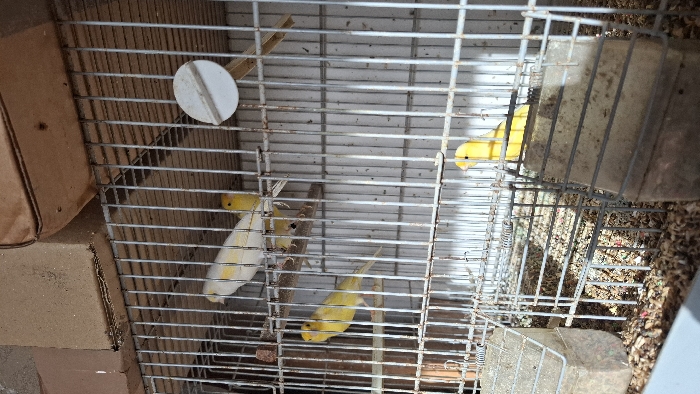 This image depicts the interior of a bird cage located in Barcelos, Portugal. The cage is constructed of gray metal bars, some exhibiting minor discoloration. Five canaries are present. One predominantly white canary with yellow wing and tail markings is perched on an upper horizontal wooden dowel. Two entirely yellow canaries are also situated on or near this upper dowel. A fourth entirely yellow canary perches on a lower, vertical wooden element on the left side of the cage. A fifth entirely yellow canary is partially visible in the lower right quadrant, near the cage floor. Two gray plastic feeders, each with a metal grate, are attached to the lower cage bars; one is visible on the left and another on the right. The cage floor contains bedding material, possibly wood shavings or seed husks, mixed with debris. A white circular plastic cap is affixed to the upper right interior cage bars. The background above the cage consists of brown cardboard or upholstered material.