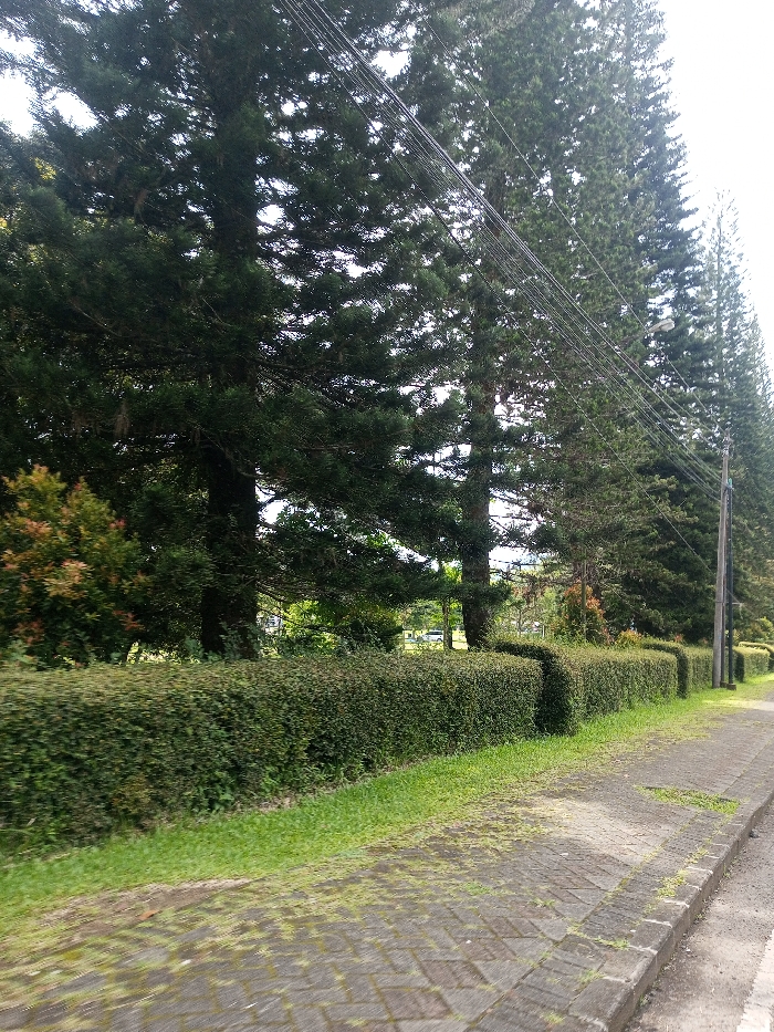 The scene, located in Namthoung, Laos, depicts a daytime outdoor environment. A paved pedestrian path, constructed from rectangular grey pavers arranged in a herringbone pattern, occupies the lower right quadrant and extends into the mid-ground. Scattered grass and debris are visible on the path's surface. A dark grey curb separates the paved path from a darker road surface on the immediate right. To the left of the path, a narrow strip of green grass precedes a uniformly trimmed, dark green hedge that runs parallel to the path and extends horizontally across the image. Behind this hedge, a dense row of tall, dark green conifer trees with pointed crowns lines the left and upper sections of the image, extending into the background under a bright, uniformly lit sky. In the upper right, multiple black utility lines are strung diagonally, supported by a dark utility pole with an attached streetlamp, visible on the right side behind the hedge. To the far left, a smaller bush with reddish-brown foliage is present. In the distant background, a white vehicle is partially discernible behind the foliage. No individuals, explicit actions, or interactions are present in the frame.