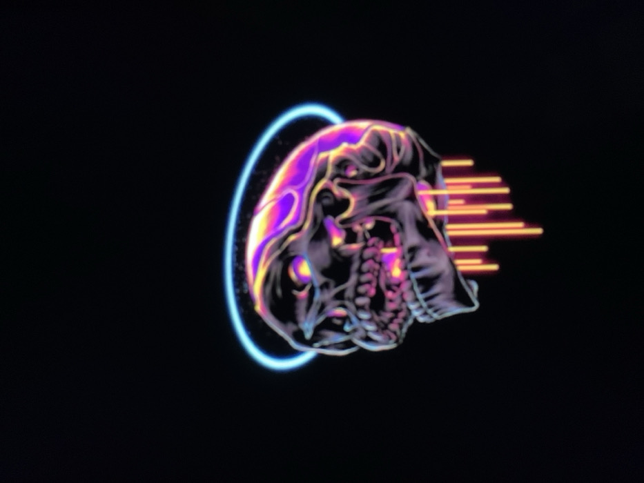The image displays a stylized human skull, presented from a three-quarter left profile, against a solid black background. The skull exhibits an iridescent, holographic appearance, with luminous pink, purple, orange, and yellow hues highlighting its contours and features. A bright, light-blue neon-style ring, resembling a halo, encircles the upper part of the cranium. Several vertical, glowing orange-yellow lines, suggestive of liquid drips or molten elements, extend downwards from the lower jawline of the skull. No people, specific actions, or other environmental elements are present within the graphic itself. The location is Kafr Sousa Municipality, Syria.