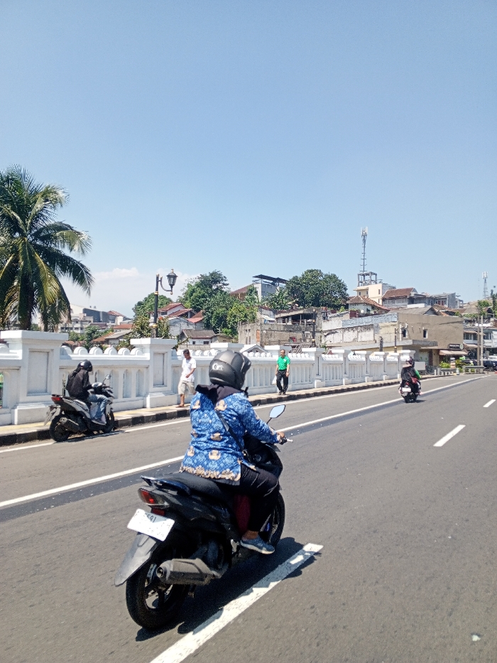 This image captures an urban street scene on a clear, sunny day in Multhan, India. The primary focus is a multi-lane asphalt road with white lane markings. In the immediate foreground, a person is operating a black scooter, moving away from the viewer. This individual wears a blue long-sleeved shirt with a light pattern, dark pants, light blue athletic shoes, and a dark full-face helmet covering a dark head covering. A dark bag is visible on the rider's left shoulder. The scooter's rear fender, tail light assembly, and a white license plate with illegible characters are visible. To the left of the road, a white concrete balustrade runs parallel to the street, suggesting a bridge or elevated structure. An ornate black street lamp with a single light fixture is positioned on this balustrade. Adjacent to the balustrade, a dark scooter is parked, with a person wearing dark clothing and a dark helmet seated on it. Further along the balustrade, two men are standing: one in a white t-shirt and light-colored shorts, and another, further back, in a green shirt and dark pants. Further down the road in the right lane, another person on a dark scooter, wearing a dark helmet, is visible, also traveling away from the viewer. The background consists of an elevated urban landscape featuring numerous buildings, some with flat roofs, interspersed with dense green foliage and several prominent palm trees. Two distinct cellular communication towers are visible on rooftops in the distance, indicating infrastructure. The sky above is clear and bright blue.