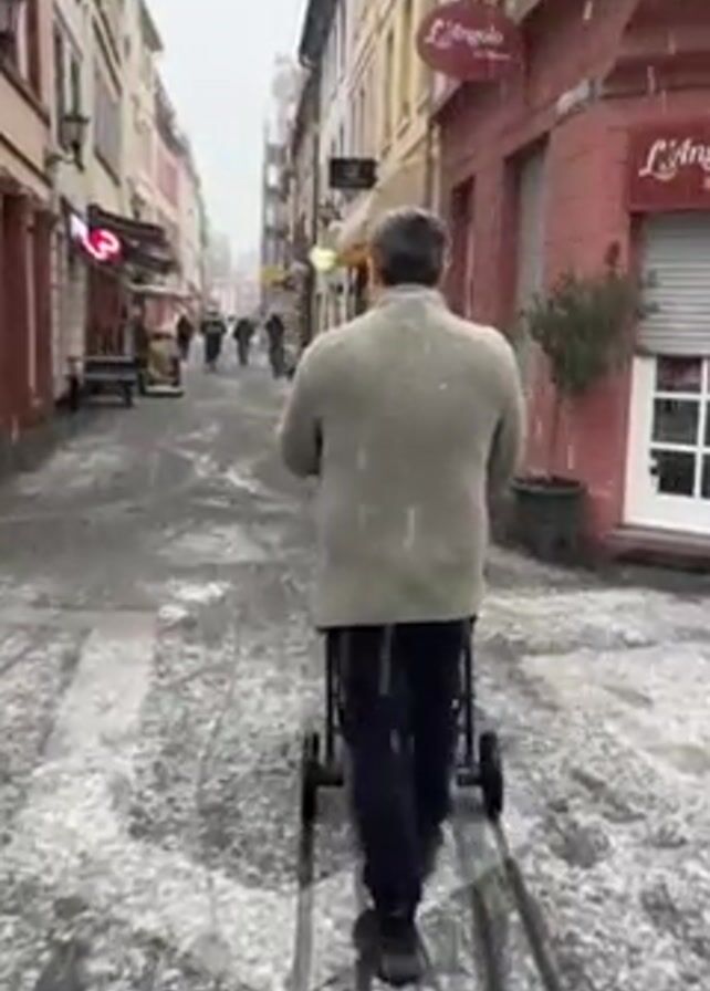The video depicts a man walking away from the camera down a narrow street covered in snow. He is wearing a light-colored sweater, dark pants, and dark shoes. He is pushing a small, black rolling cart. The street is lined with buildings, many of which are painted in shades of red and orange. Some have awnings over their storefronts. There are other people walking in the distance. Snow is falling. One building has the word "L'angolo" on it with an Italian flag. The street is uneven.