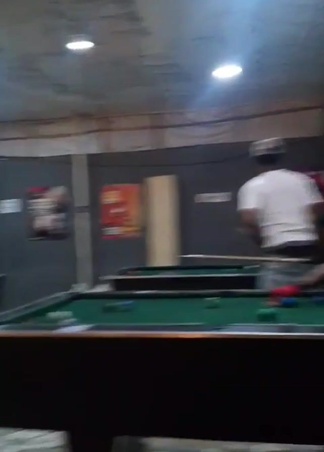 In a dimly lit indoor pool hall with a cracked, stucco-like ceiling, two men are playing pool. One man, wearing a white t-shirt, grey pants, and a patterned hat, stands by the pool table with a cue stick in hand. He glances at his companion who is wearing a black and white striped soccer jersey and red gloves. The soccer jersey-clad man bends low over the pool table to take a shot, then straightens up to observe the outcome. Other pool tables stand in the background, along with advertisements for drinks.