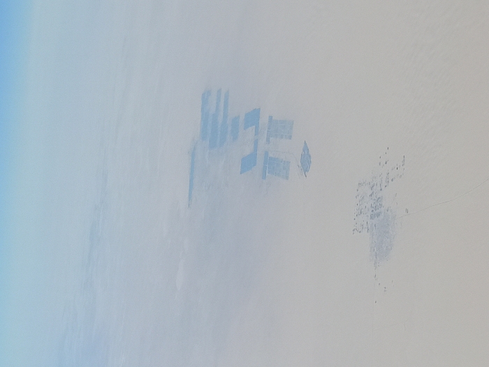 A slightly blurry aerial shot reveals two distinct groups of structures amidst a pale, hazy backdrop. One group consists of larger, rectangular buildings arranged in a grid-like pattern. The other group appears as a denser cluster of smaller, less defined structures. A faint, thin line stretches away from this cluster. A portion of the image shows what could be a cloud formation near the edge.
