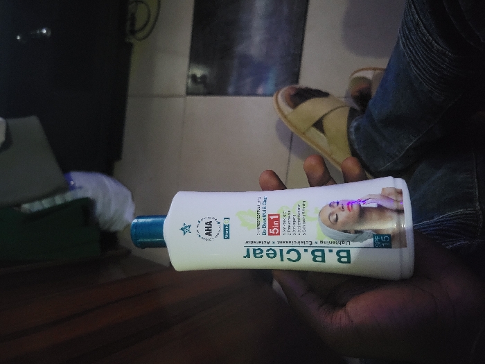 The image displays a close-up of a dark-skinned hand holding a white "B.B. Clear" skin lightening lotion bottle with a teal flip-top cap. The bottle's label features "AHA," "Vitamin C," "SPF 15," and describes the product as "Lightening + Eclaircissant + Aclarante" with "5 in 1" benefits, alongside an image of a woman applying a luminous device to her face. Below the hand, a person's legs are visible, dressed in blue denim jeans and light-colored, possibly beige, cross-strap sandals. The immediate background on the left shows dark wooden paneling, while the right side reveals a partial view of a black and white checkered tiled floor and indistinct dark objects. The scene is an unknown indoor location.