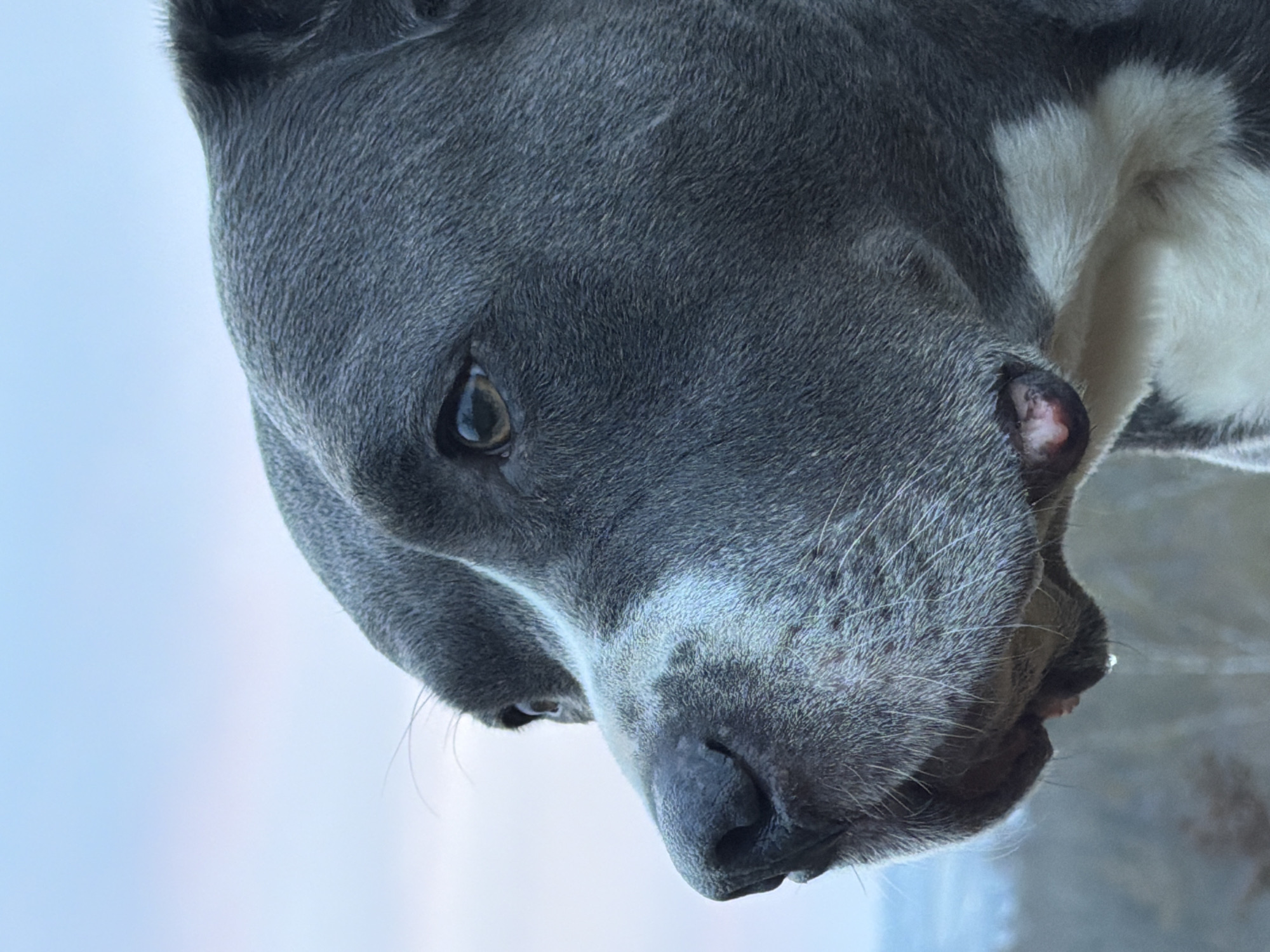 The image displays a close-up, profile view of a domestic canine's head, oriented to the left, situated in the city of Schifflange, Luxembourg. The animal possesses short, dense, slate-grey fur across its head, with prominent white fur patches visible on its muzzle and extending onto its chest area in the lower right portion of the frame. Its left eye, positioned centrally, is dark brown with a distinct pupil, reflecting ambient light. A single, clear droplet of liquid is observed suspended from the underside of the dog's lower lip or jowl. The background is out-of-focus, featuring a gradient sky transitioning from light blue at the top to a lighter, hazy horizon. Blurred, dark arboreal elements are faintly discernible in the lower left background, indicating an outdoor, natural setting.