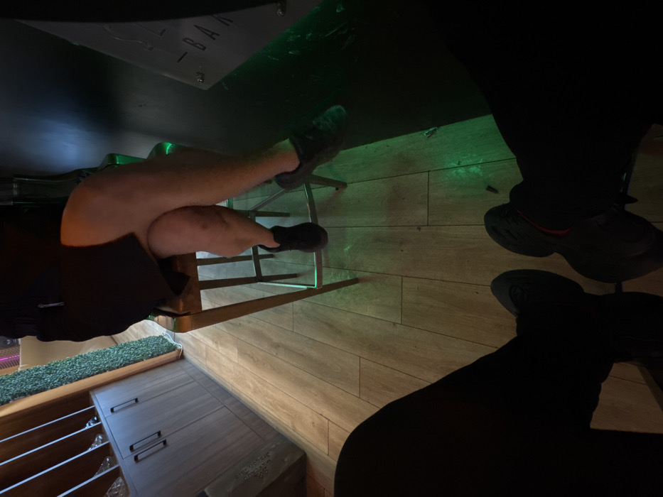 The image depicts an interior scene within Luxor Bar, Sofia, Bulgaria, captured from a low, seated perspective. In the immediate foreground, the legs of an individual wearing dark trousers and dark athletic shoes with subtle red sole accents are visible, resting on a light-colored wooden plank floor. Opposite, a second individual is seated on a metallic bar stool with a footrest, their legs crossed at the knee. This person is wearing dark shorts or a skirt and dark athletic footwear. To the right of the seated individual, a dark bar counter displays white text partially visible as '-BAR', illuminated along its edge by a horizontal strip of green LED light. The left background features a light wood-topped cabinet with two dark brown doors, above which is a wall fixture with diagonal slats holding several clear, indistinct objects. Adjacent to this cabinetry is a vertical section of artificial green foliage or turf. The environment is dimly lit, with the green LED lighting providing a prominent accent.