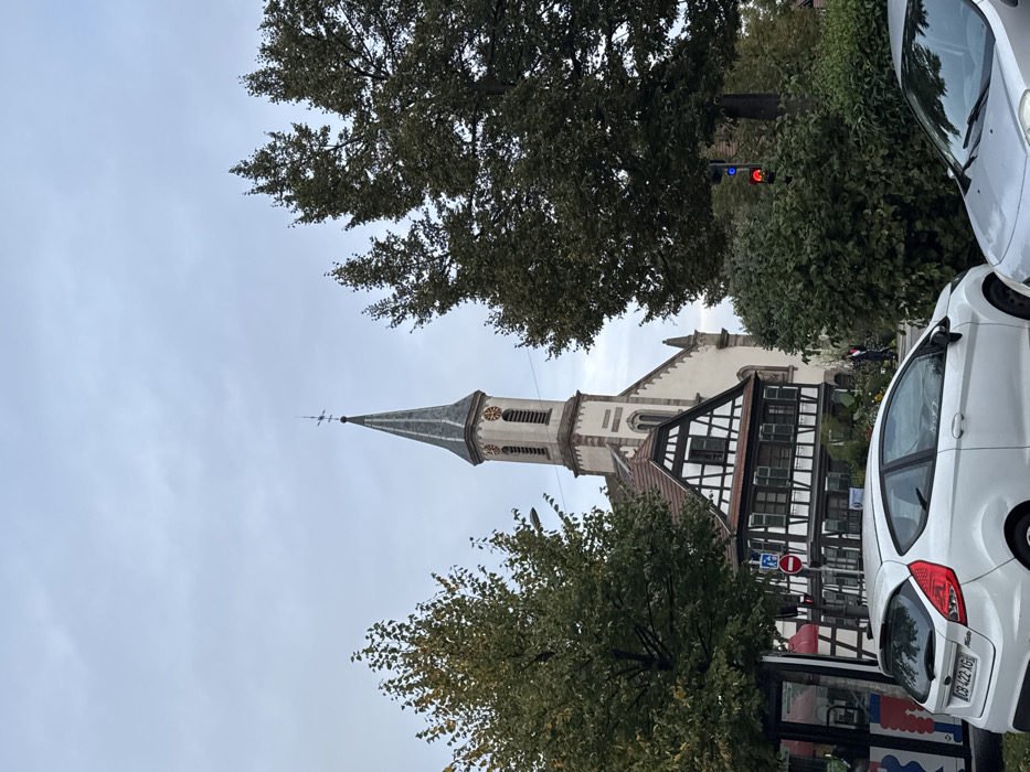 This image captures a street view in Hoenheim, France, under an overcast sky. The prominent structure in the background is a light-colored church featuring a tall, grey-tiled spire topped with a finial and cross, a belfry with arched openings, and clock faces displaying Roman numerals. To the left and slightly in front of the church stands a two-story traditional half-timbered house with a steep brown-tiled roof, white infill, dark timber beams, and visible windows with dark shutters. Numerous trees with green and yellowing leaves frame the scene, with dense green bushes in the foreground and midground. In the immediate foreground on the left, a white two-door Ford Fiesta hatchback is parked, displaying a French license plate 'CB 422 XG' on its rear. To its right, the front portion of a silver car is partially visible, also parked. Street furniture includes a red circular prohibitory sign and a blue square informational sign located near the half-timbered house. A traffic light, showing both red and blue illuminated signals, is partially obscured by foliage on the right side of the image. One individual, wearing dark clothing with a visible red stripe, is standing on the pavement to the right of the half-timbered house, partially hidden by bushes.