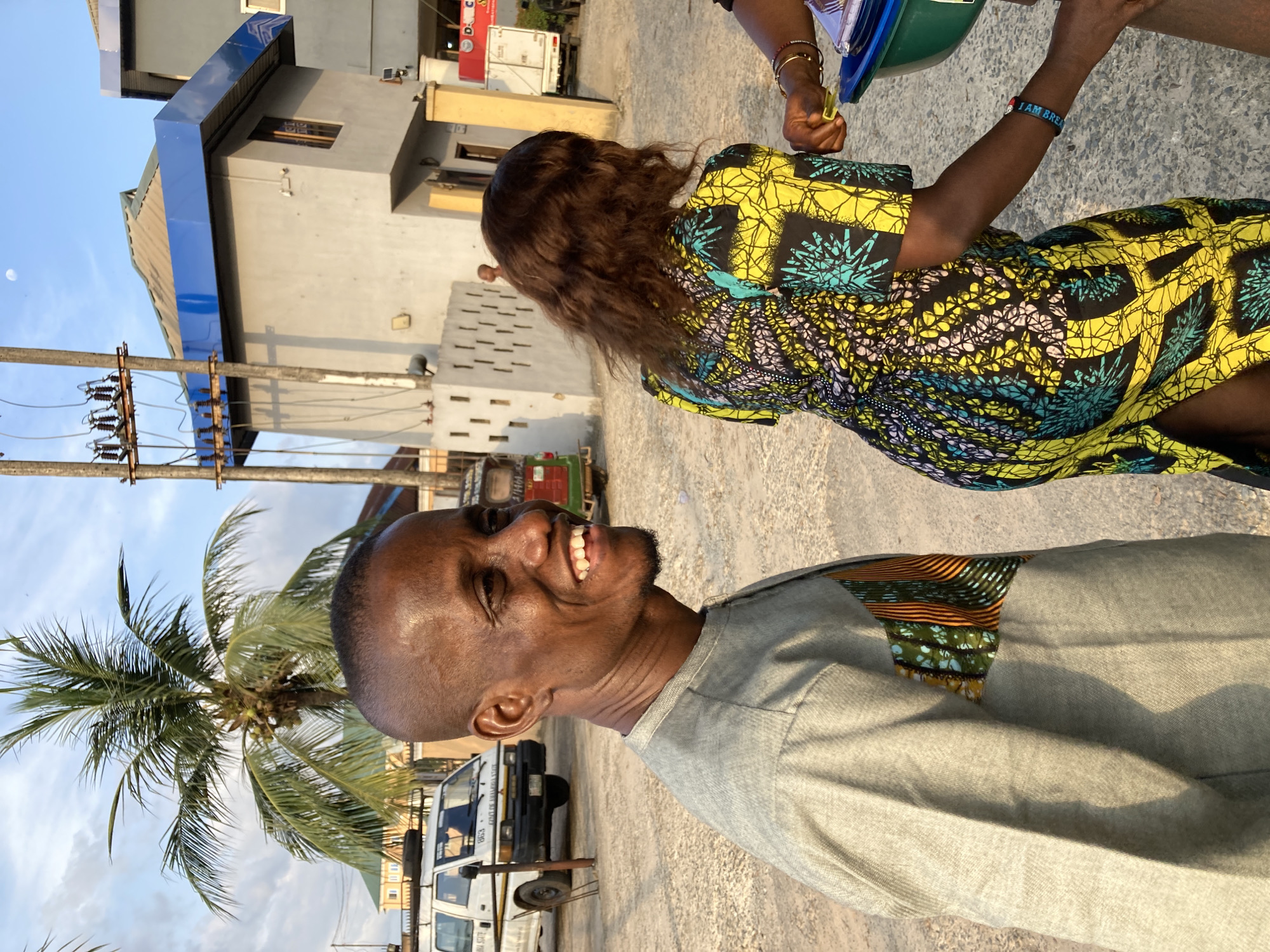 man with short, dark hair and a gray shirt with patterned fabric on the shoulder. He is smiling and looking to the left of the frame. Beside him, a woman with long, wavy brown hair is wearing a brightly colored patterned yellow and black dress. She is facing away from the camera. In the background, there are buildings with blue trim, utility poles, and a palm tree. A white van is visible parked near the curb. The location appears to be a street in Aba, Nigeria.