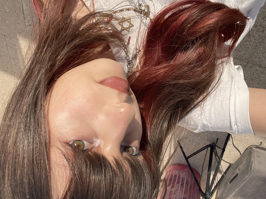 An overhead-angle shot depicts a female individual lying outdoors in Petah Tikva, Israel. The subject's upper body is visible, featuring fair skin, open green/hazel eyes, and glossed, reddish-brown lips. Long, dark brown hair with significant red highlights frames the face and rests upon a white t-shirt. Multiple layered necklaces are present, including a gold-colored Star of David pendant and a heart-shaped pendant. The individual's gaze is directed towards the camera. The environment consists of a light-colored hard ground surface, likely pavement, illuminated by direct sunlight which creates distinct shadows. In the lower-left background, a partially visible pink plastic woven basket, a black tripod-like stand, and a grey rectangular case or bag are present.