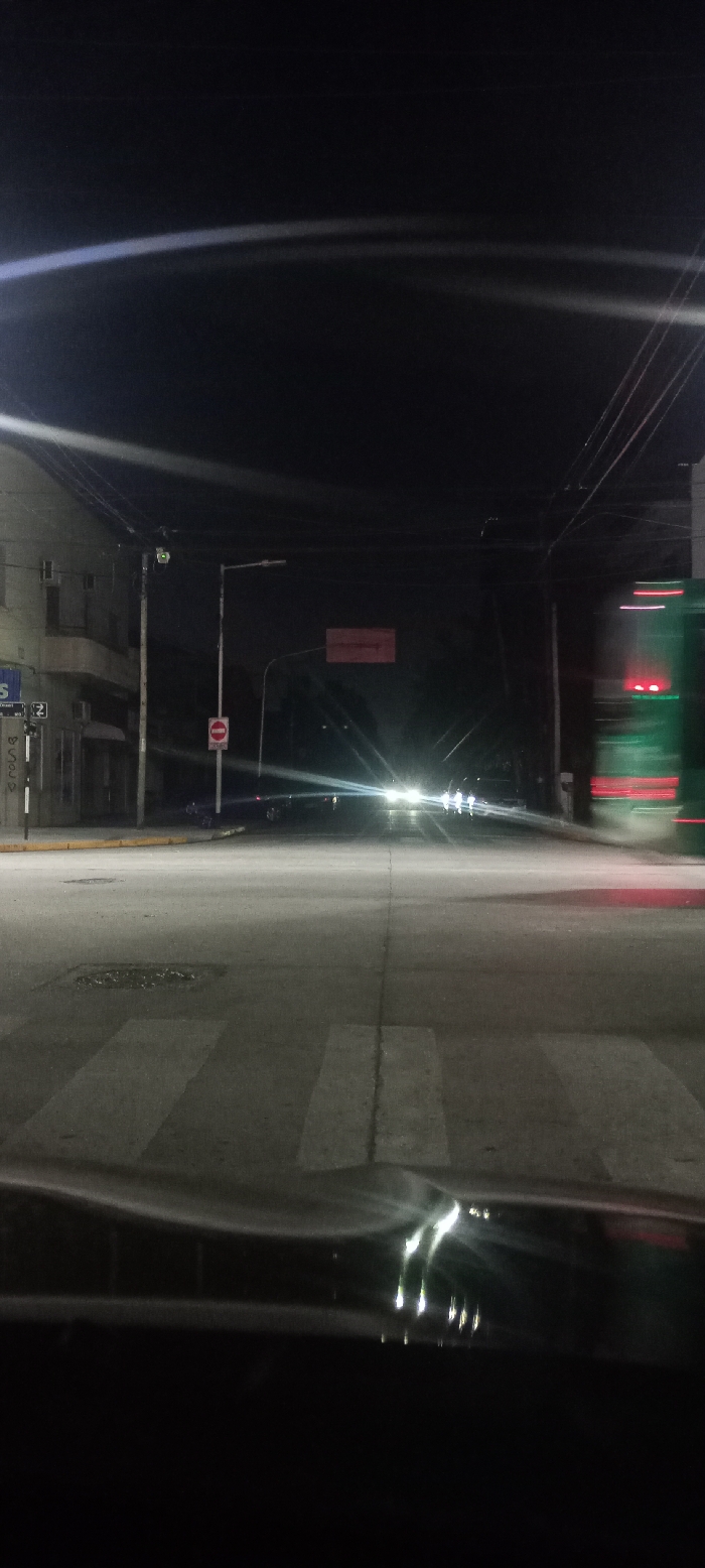 A nighttime street scene is captured from inside a vehicle. A crosswalk is visible in the foreground, leading towards an intersection illuminated by oncoming car headlights. A "Do Not Enter" sign stands on the left side of the road. A building and streetlights are also visible. A large green bus is blurred on the right, indicating movement. Power lines stretch across the dark sky above. Reflections appear on the dashboard of the vehicle.
