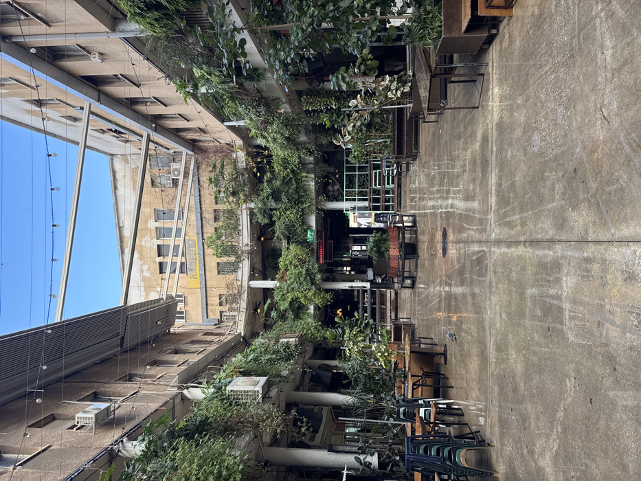 An outdoor courtyard is lined with buildings. Lush greenery and plants adorn the facades and overhead structures. Tables and chairs are arranged along the paved ground, indicating an open-air cafe or dining area. String lights hang above, stretching across the courtyard. The architecture is a mix of old and modern, with visible air conditioning units on the older buildings.