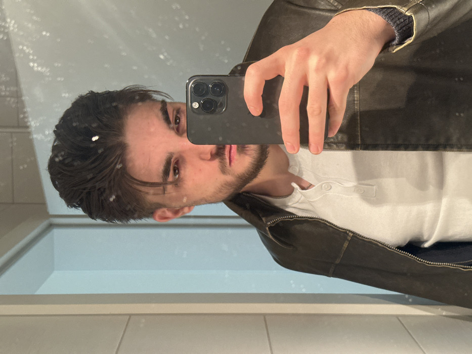 An individual is depicted in a mirror selfie taken within an interior space in Bertrange, Luxembourg. The subject is a male with dark, swept-back hair and a short beard. He is wearing a dark brown leather jacket over a white long-sleeved Henley shirt. His right hand holds a dark-colored smartphone, featuring a triple-lens camera array, positioned to capture his reflection. The subject's gaze is directed towards the camera. The background, visible through the reflection, consists of light-colored walls, possibly tiled, and a partial doorframe or architectural opening on the left. The mirror surface exhibits minor speckling or dust particles.