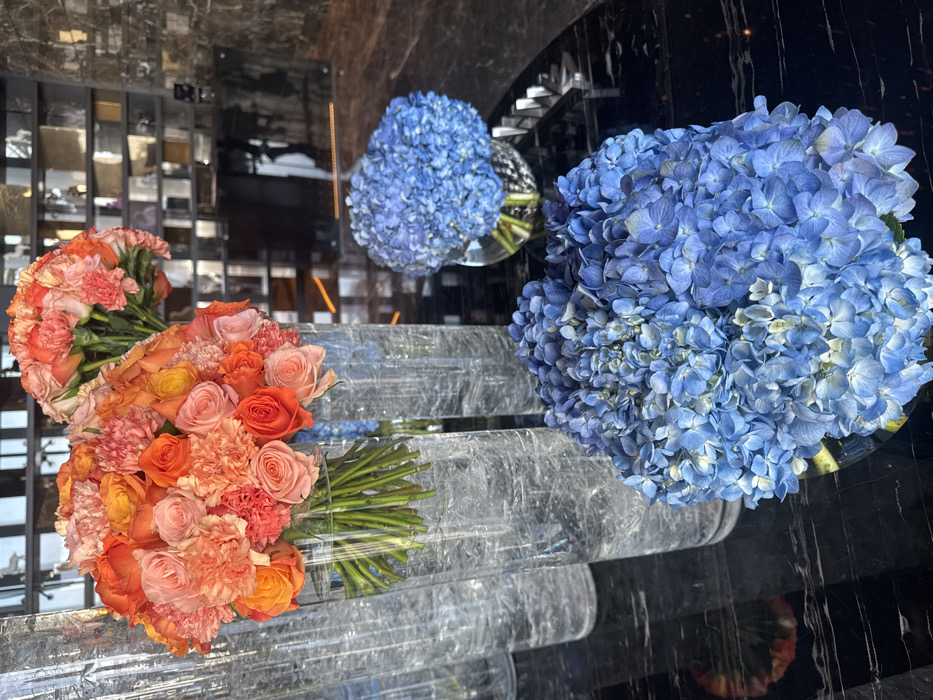 The scene depicts an interior setting, likely a commercial or public space, in Bawshar Province, Oman, showcasing multiple floral arrangements on a dark, reflective surface. In the foreground and midground, two prominent bouquets composed of orange, coral, and light pink roses, mixed with similarly colored carnations, are displayed. Each bouquet is contained within a tall, clear cylindrical glass vase filled with water, positioned vertically. To the right and slightly lower, two arrangements of blue hydrangeas are present. The arrangement in the immediate foreground is a dense cluster of blue florets in a low, round, clear glass bowl, exhibiting varying shades of blue from light to medium. Behind it, another similar but slightly smaller arrangement of blue hydrangeas rests in an identical round glass bowl. All floral displays are situated on a highly polished, dark black marble or granite surface, which exhibits subtle white veining and reflects the ambient light and portions of the flowers. The background features a wall composed of numerous rectangular mirrored or highly reflective panels, arranged in a grid-like pattern. These panels reflect distorted images of the environment, including architectural elements and diffuse light, suggesting an indoor, possibly upscale, setting. No individuals are visible in the image.