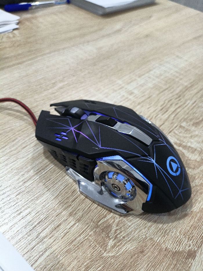 The image displays a black, wired gaming mouse resting on a light brown wooden surface. The mouse features a matte black body with silver-colored metallic or chromed plastic accents. Integrated LED lighting emits blue and purple illumination from the scroll wheel area, geometric line patterns on the top surface, and various vents. A red braided cable extends from the front left of the device. In the out-of-focus background, a blue ballpoint pen and a stack of white papers are partially visible. No individuals are present, and no actions or interactions are depicted. The scene is an indoor environment in Fergana City, Uzbekistan.