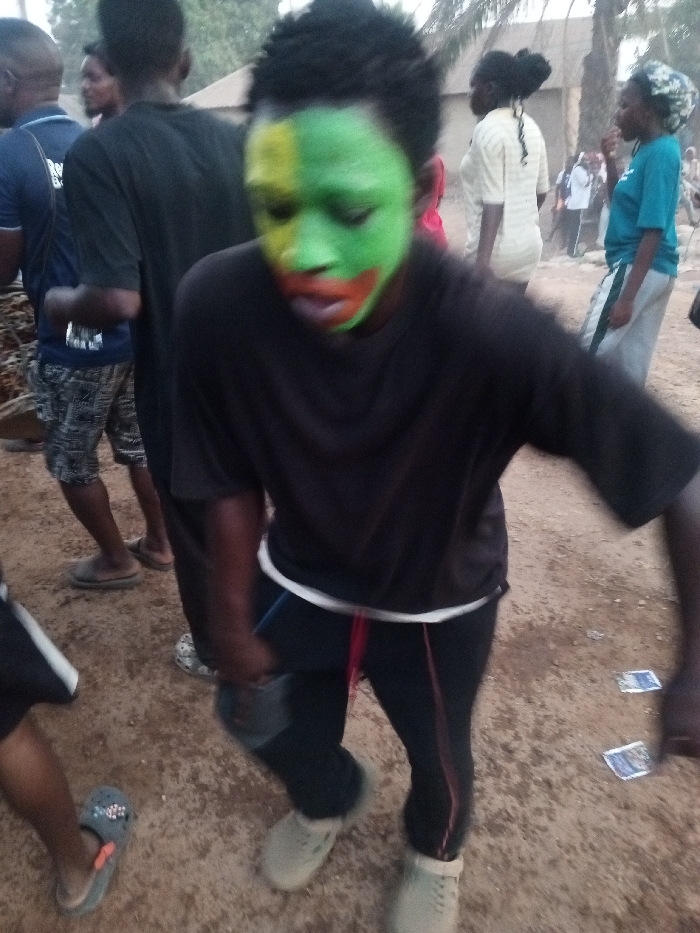 A person with green and yellow face paint and red lips dances outdoors, wearing a black shirt, black pants with a red stripe, and tan shoes. A white string hangs from the pants. Other people are visible in the background, some standing and some walking. The ground is dirt, and there are small pieces of paper scattered on the ground.