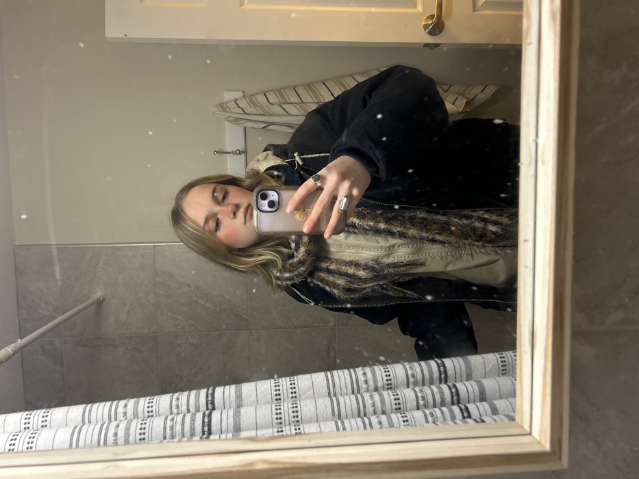 A mirrored selfie shows a young woman wearing a black jacket with a fur-lined collar
