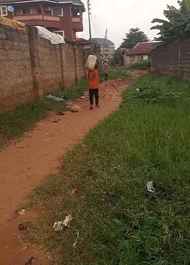 A person in an orange shirt carries a white container on their head while walking on a dirt path. The path is bordered by walls on one side and grass on the other. There is litter along the path and in the grass. In the background, there are houses and power lines. Another person is further down the path. The sky is overcast.