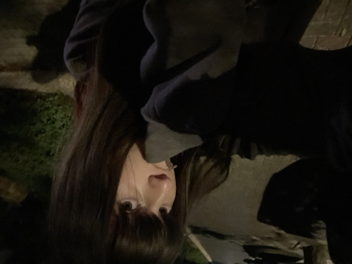 A young woman with long, dark hair is shown from a low angle, appearing upside down. She has fair skin, bangs, and wide eyes, and her mouth is slightly open. She is wearing a grey hoodie. The background consists of dark, indistinct foliage on the left and a blurry brick-like surface on the right. The overall lighting is dim, with shadows obscuring parts of the scene.