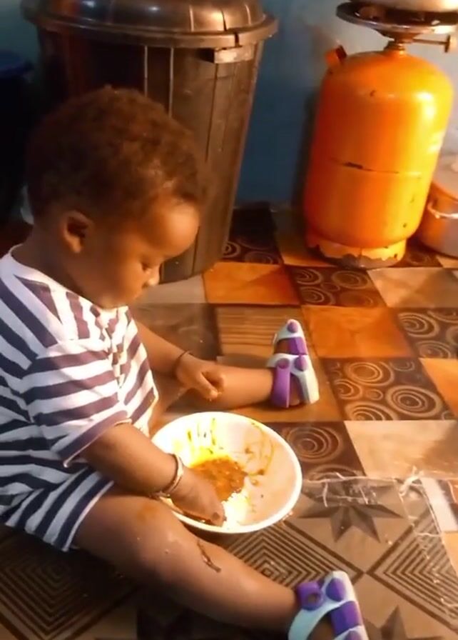 baby sitting on a tiled floor, eating from a white bowl with their hands. They are wearing a striped shirt and light blue shoes with purple and white accents. The floor is covered with patterned tiles. A black trash can, an orange gas tank, and some pots and pans are visible in the background. The camera then moves to a woman sitting on the floor, looking at her phone. She is wearing a blue tank top and patterned pants. She is barefoot. The lighting is bright, likely from a nearby window.