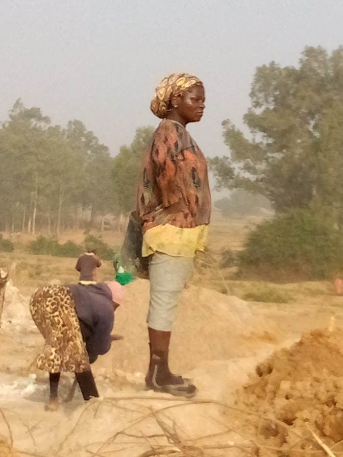 Three people stand on a dusty landscape with trees in the background. The prominent figure, a woman in an earth-toned headscarf and patterned blouse, gazes to the right. She wears light-colored capri pants and sandal-like footwear. To her left, a figure bends over, clad in a leopard-print skirt and dark top. Further back, a third person in a dark shirt stands near a light-colored mound. The scene suggests hard work and the pervasive dustiness indicates a dry environment.