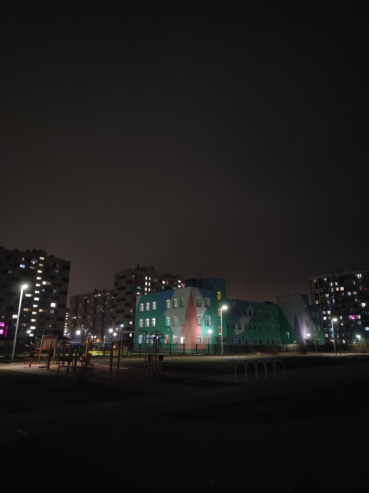nighttime scene in an urban area. The location is most likely a playground or recreational area in a city of unknown location. In the background, there are several multi-story apartment buildings with illuminated windows. Closer to the viewer, there's a brightly lit, multi-colored building with a modern design; the building is predominantly painted green, white, and red. Streetlights illuminate the area, creating a stark contrast between the dark foreground and the lit buildings. The foreground is largely obscured in darkness, but several playground structures and metal arches are visible in the mid-ground. The sky is uniformly dark, indicating it is night. There are no people visible in the scene.