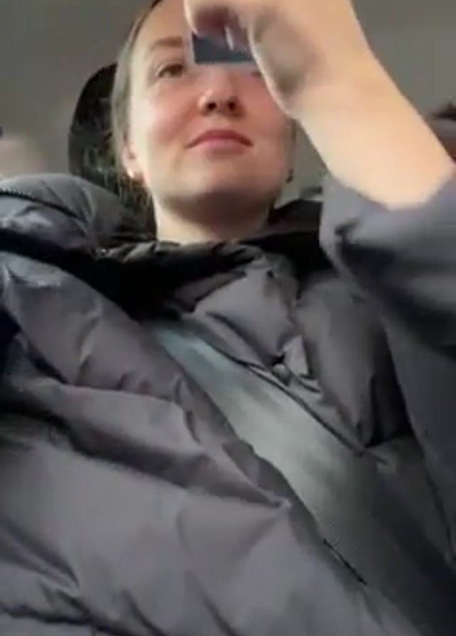 A woman wearing a black puffer jacket is sitting in the driver's seat of a car, putting on mascara while looking in a small, square mirror. She's wearing a seatbelt. The car appears to be stationary.