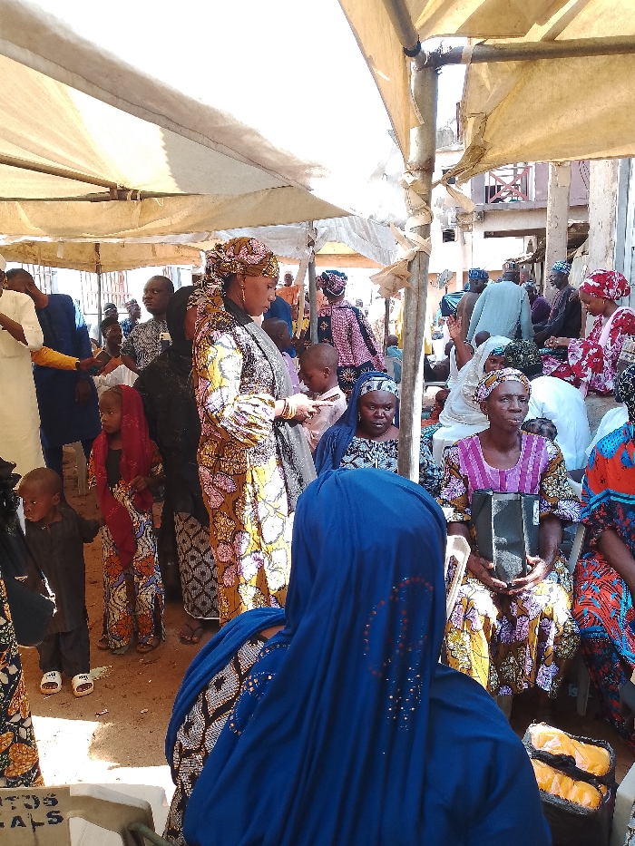 An outdoor gathering is depicted under a temporary, light-colored tarp canopy in the city of Unknown, Unknown. The ground is dirt. Numerous individuals of African ethnicity are present, consisting of men, women, and children. Most adults wear traditional, brightly patterned clothing and head coverings. In the immediate foreground, a woman in a blue hijab with reflective embellishments is seen from the back, facing away from the camera. To her left, a young boy in a dark outfit and white sandals stands adjacent to a young girl in a red head covering and a patterned dress. A woman in a yellow, orange, and black patterned dress with a matching headwrap stands prominently in the mid-ground, looking down at a small object in her hands. To the right of a central support pole for the canopy, multiple women are seated on chairs. One woman in a purple and pink patterned dress with a matching headwrap holds a dark, rectangular object. Another woman in a blue head covering is seated to her left. In the background, numerous additional individuals are visible, both standing and seated, suggesting an extensive gathering. One person in the far background has an arm raised. On the ground in the lower right, yellow packaged goods are contained within a black crate. A partially visible handwritten sign with "TOS" and "ALS" is present on a white surface in the lower left. Multi-story buildings are visible in the far background, beyond the canopy structure, under clear daylight.