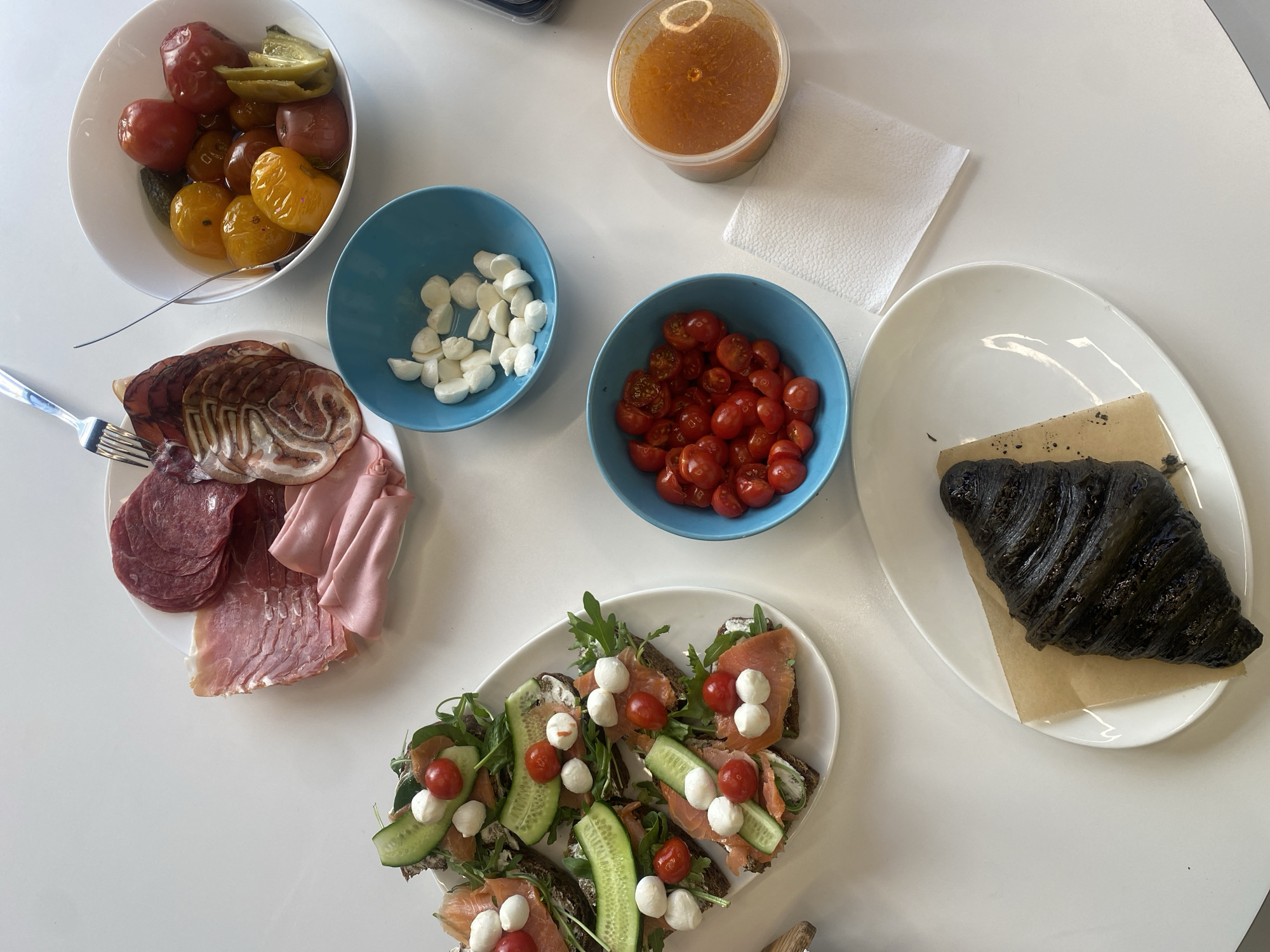This image displays an overhead view of a varied meal spread on a white tabletop, situated in an indoor environment in Moscow, Russia. The scene features an oblong white plate laden with eight open-faced sandwiches. These sandwiches are prepared on dark bread, topped with a layer of cream cheese, green arugula, smoked salmon, a green cucumber slice, small red cherry tomatoes, and white mozzarella pearls. Adjacent to this, a large white round plate presents an assortment of sliced deli meats, including red salami, translucent pink prosciutto, light pink folded mortadella, and a section of sliced cured pork. A silver metal fork rests on this plate. In the upper right, a white bowl contains pickled items, specifically whole red and yellow cherry tomatoes mixed with sliced green peppers or pickles, with a small metal spoon partially submerged. Below the charcuterie plate, a small blue bowl is filled with numerous small white mozzarella pearls. Directly below this, another small blue bowl contains an abundance of whole red cherry tomatoes. To the right of the red cherry tomato bowl, a transparent plastic container with a clear lid holds a quantity of orange-colored roe. A white folded paper napkin rests beneath this container. At the bottom of the frame, a white oval plate presents a single dark-colored, possibly charcoal-infused, croissant resting on a piece of light brown parchment paper. No individuals are present in the image, and no active interactions or actions are depicted.