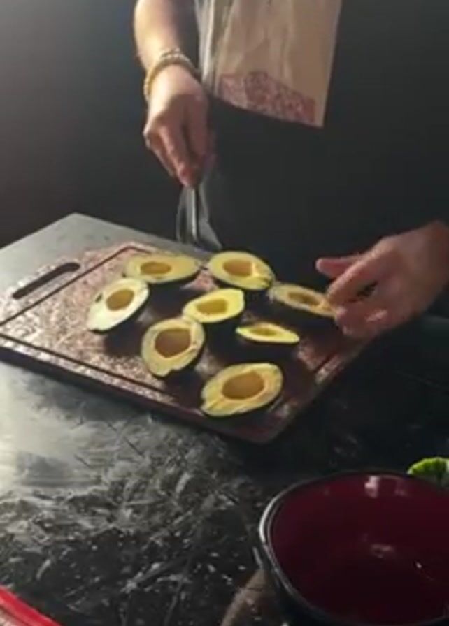 A man is preparing avocados on a speckled kitchen counter. He wears a black T-shirt, a gold bracelet, and a black smartwatch. He holds an avocado half in his left hand and a small knife in his right, scoring the avocado flesh into a grid. Several other avocado halves sit on a brown cutting board. A red bowl is visible to the right. A packet of what appears to be shredded cheese sits on the counter's left edge. The lighting in the room is somewhat dim, but the counter and avocado halves are well-lit.