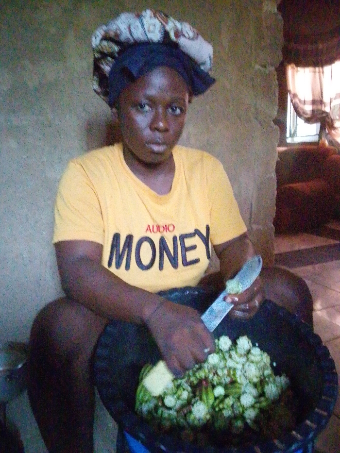 An adult female is depicted indoors in a residential setting, seated in a low, possibly crouching position. She has dark skin and is wearing a yellow t-shirt with the word "AUDIO" in red above "MONEY" in black, and a layered head covering consisting of a dark wrap beneath a patterned fabric. She holds a wide, dull silver-colored blade in her right hand, actively processing green vegetables, consistent with sliced okra, into a black plastic basin situated between her legs. Her left hand supports a larger piece of the vegetable as it is being cut. A ring is present on the fourth finger of her left hand. Her gaze is directed towards the camera. The background consists of a textured light brown wall on the left and an open doorway on the right, revealing a window with light-colored sheer curtains and a dark upholstered furniture piece. The floor visible is a light-colored tile.