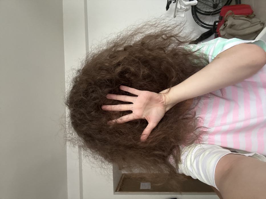 The image presents an individual inside a room located in Ramat Gan, Israel. The central subject, visible from the chest up, has voluminous, frizzy, brown hair that largely obscures their head. Their face is completely concealed by their raised left hand, which is held palm-outward towards the viewer with fingers splayed. The individual is wearing a short-sleeved t-shirt with horizontal stripes in white, pink, and light green/yellow on the sleeves. The immediate background consists of plain white walls and a white ceiling. To the left of the subject, a partial view of a light-colored wooden door frame and a small white paper attached to the wall are discernible. To the right, a bicycle with a black tire, bearing the text "Katia" on its sidewall, is partially visible. Below the bicycle, two luggage items are present: one beige-tan bag and one red suitcase.