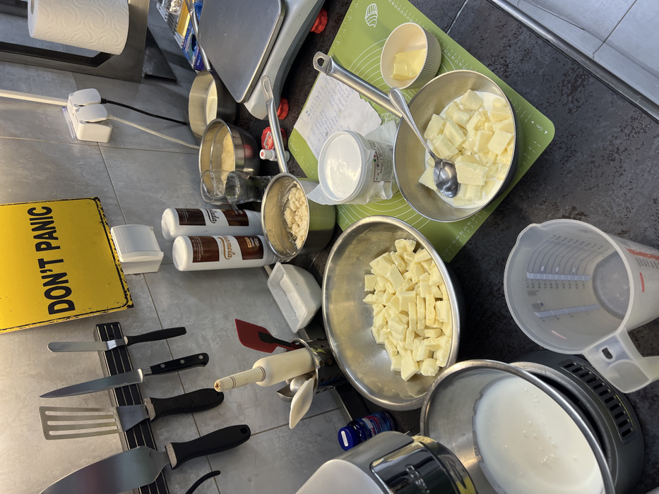 This image depicts an active food preparation area within a kitchen located in Budva, Montenegro. The scene is observed from a slightly elevated, diagonal perspective looking down onto a dark countertop and a light-colored tiled wall. On the tiled wall, a rectangular, yellow metal sign with "DON'T PANIC" in black capital letters is mounted. Below and to the right of this sign, a white power strip with two European-style plugs connected is visible. To the left of the sign, a magnetic strip holds four metal utensils: two spatulas of differing widths, a chef's knife with a black handle, and a narrower palette knife, also with a black handle. To the far right, a roll of white paper towels is secured on a dispenser. The countertop below is primarily dark grey. On the left, the top portion of a silver-colored Kenwood stand mixer is visible, with its mixing bowl containing a white liquid. Next to the mixer, a blue-capped bottle is partially visible. Further right, a large silver mixing bowl holds a quantity of irregularly cut, pale yellow or white solid chunks, resembling white chocolate or butter. Towards the center-right of the countertop, a green silicone baking mat is laid out. On this mat, a handwritten recipe or notes on white paper are positioned. To the left of the notes, a white plastic tub with a lid containing a thick white substance (likely cream or yogurt) is present. To the right of the notes, a small silver saucepan with a handle contains more cubed, pale yellow solids (butter) submerged in a white liquid, with a metal spoon resting within. Next to this saucepan, a small white bowl contains a chunk of butter. In the background-center, a metal utensil holder contains various items including a wooden rolling pin, a red rubber spatula, and other tools. To its right, two tall white bottles, one labeled "Caramela," are present. Beyond these, a clear glass stands near a small pot with a lumpy white mixture and a small red bottle. A silver digital kitchen scale with a white platform is situated in the upper right background. In the foreground, a large, clear plastic measuring jug with red markings is prominent on the dark countertop. No people are visible in the scene. The items suggest preparations for baking or confectionery.